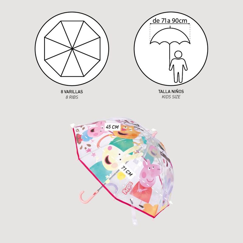 Η CERDÁ – Peppa Pig Bubble Manual Umbrella 45cm είναι μια χαριτωμένη διάφανη ομπρέλα με σχέδιο Peppa Pig, κατάλληλη για μικρά παιδιά.