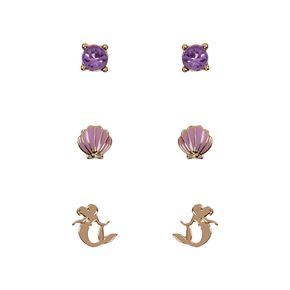 The earring pack includes a pair of earrings with purple stones, purple shell and gold Ariel design.