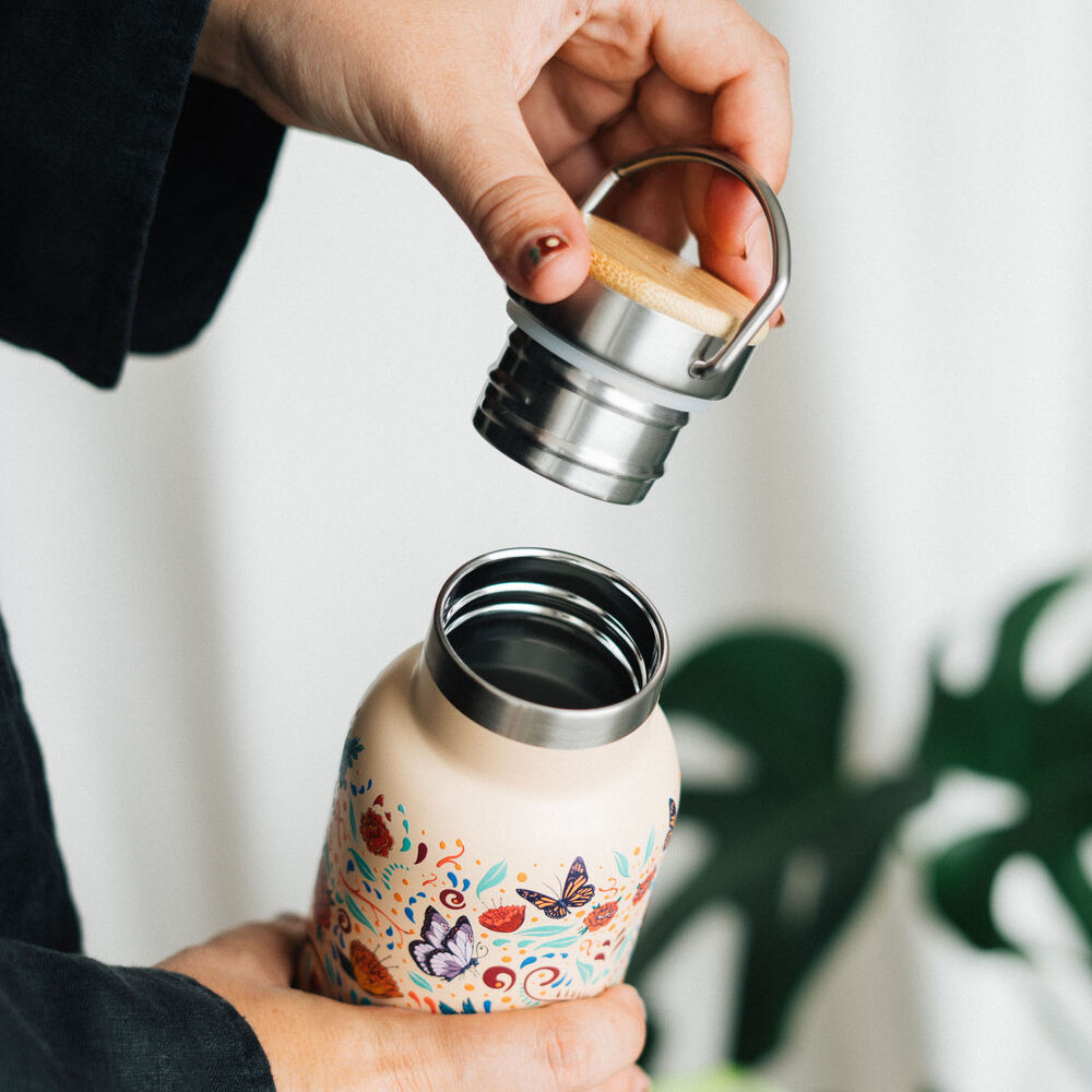 Capacity: 500ml. It has an airtight wooden cap and a metal handle for easy transport. Its double stainless steel inner layer keeps drinks hot for up to 12 hours and cold for up to 24 hours. It is BPA-free, ensuring safe consumption.