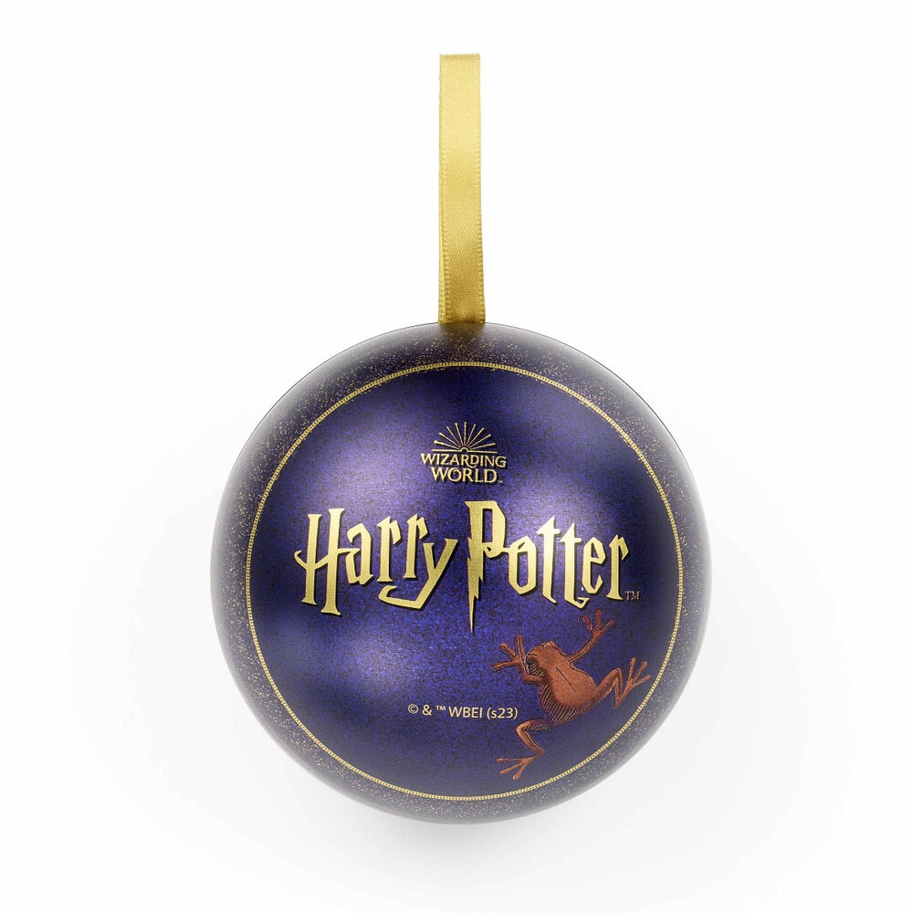 Christmas ball diameter: 8,5cm. Zinc alloy 93% zinc + 3% copper + 4% aluminmim + tinplate. Inside this Christmas bauble you will find a chocolate frog with a pin, but be careful not to eat it! This ornament is designed to be hung on a ribbon and can be kept as a souvenir or re-hung on the Christmas tree every year.