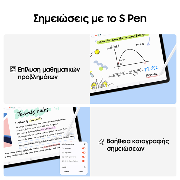 Samsung Galaxy Tab S10 FE 5G 128GB GrayΕμβληματική εμφάνιση Εμπνευστείτε και εκφραστείτε με τα κομψά Galaxy Tab S10 FE και Tab S10 FE+ με S Pen και ΑΙ λειτουργίες. Διαθέσιμα σε 3 διαφορετικά χρώματα για μια εντυπωσιακή εμφάνιση. Επιλέξτε το δικό σας σε Gray, Silver ή Blue. Κυκλώστε το και βρείτε το, σε μεγάλη οθόνη Αναζητήστε οποιαδήποτε εικόνα, βίντεο ή κείμενο στην οθόνη σας. Κυκλώστε ή πατήστε το αντικείμενο που σας ενδιαφέρει και λάβετε αποτελέσματα αναζήτησης έυκολα. Με μεγάλη οθόνη Μία εκπληκτική εμπειρία οθόνης 10,9 ιντσών στο Galaxy Tab S10 FE και 13,1 ιντσών στο Tab S10 FE+, τη μεγαλύτερη οθόνη που έχει υπάρξει ποτέ στη σειρά Galaxy Tab FE. Γρήγορη απόδοση Δημιουργήστε, μελετήστε και παίξτε με την ομαλή απόδοση του επεξεργαστή Exynos 1580. Ζήστε την εμπειρία που βασίζεται στην τεχνητή νοημοσύνη με εύχρηστα χαρακτηριστικά παραγωγικότητας. Εκτελέστε πολλαπλές εργασίες απρόσκοπτα με μεγάλη μνήμη και στα δύο μοντέλα και αποθηκεύστε ό,τι αγαπάτε με υποστήριξη κάρτας microSD έως 2 TB. Εκπληκτική οθόνη. Υψηλή φωτεινότητα Ανακαλύψτε την οθόνη υψηλής ανάλυσης με ευκρινείς λεπτομέρειες και εκπληκτικά γραφικά στα 90 Hz. Το Vision Booster διασφαλίζει ότι οι προβολές σας παραμένουν φωτεινές ακόμα και σε εξωτερικούς χώρους με έως και 800 nits σε λειτουργία υψηλής φωτεινότητας. Παραμείνετε προσηλωμένοι στο περιεχόμενο της οθόνη σας, χάρη στο χαμηλό μπλε φωτισμό για άνεση στα μάτια. Λεπτό και ελαφρύ Galaxy Tab S10 FE ή Tab S10 FE+; Όποιο και να επιλέξετε, είναι λεπτό και ελαφρύ, σχεδιασμένο να ταιριάζει σε ένα δυναμικό τρόπο ζωής. Εύκολο στη μεταφορά, για εργασία και διασκέδαση οπουδήποτε επιθυμείτε. Εκκίνηση των ΑΙ λειτουργιών με ένα πάτημα Πατήστε το AI πλήκτρο και ξεκινήστε την αναζήτηση με τη βοήθεια του ΑΙ. Το πλήκτρο ΑΙ στο πληκτρολόγιο, σας δίνει εύκολη πρόσβαση στις ΑΙ λειτουργίες. Εκπληκτική ανάλυση με 13MP κάμερα Απολαύστε φωτογραφίες και βίντεο σε υψηλή ανάλυση. Η αναβαθμισμένη κύρια κάμερα 13 MP καταγράφει με περισσότερη ευκρίνεια και λεπτομέρεια, κάνοντας τις λήψεις σας μαγευτικές. Ανθεκτικά στο γλυκό νερό και τη σκόνη Τα Galaxy Tab S10 FE και Tab S10 FE+ με S Pen έχουν πιστοποίηση IP68 για ανθεκτικότητα στο γλυκό νερό έως 1,5m και μέχρι 30' και τη σκόνη. Εξατομικευμένη επισκόπηση συμβατών συσκευών στο σπίτι Παρακολουθήστε τις συμβατές συσκευές του σπιτιού σας με μια σύνοψη με πανοραμική θέα στο Home Insight. Ο πίνακας εργαλείων σάς παρέχει βασικές πληροφορίες για το σπίτι σας με βάση συνδεδεμένους αισθητήρες και συσκευές. Εξερευνήστε το χώρο σας χρησιμοποιώντας έναν τρισδιάστατο χάρτη και λάβετε εξατομικευμένες προτάσεις AI. Galaxy Spotlight εφαρμογές στη διάθεσή σας Δημιουργικότητα με τα Galaxy Tab S10 FE και Tab S10 FE+. Εμπνευστείτε με τις εφαρμογές LumaFusion, Goodnotes, Clip Studio Paint, Noteshelf 3, Sketchbook και Picsart.