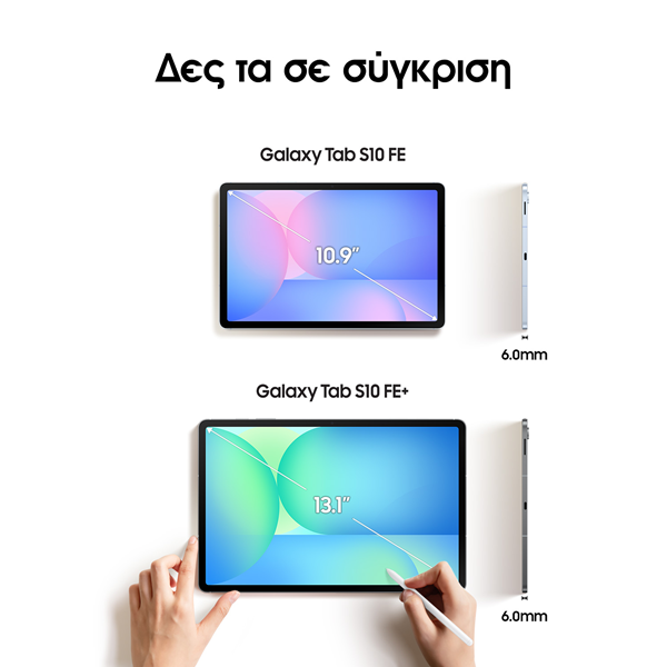 Samsung Galaxy Tab S10 FE WiFi 128GB GrayΕμβληματική εμφάνιση Εμπνευστείτε και εκφραστείτε με τα κομψά Galaxy Tab S10 FE και Tab S10 FE+ με S Pen και ΑΙ λειτουργίες. Διαθέσιμα σε 3 διαφορετικά χρώματα για μια εντυπωσιακή εμφάνιση. Επιλέξτε το δικό σας σε Gray, Silver ή Blue. Κυκλώστε το και βρείτε το, σε μεγάλη οθόνη Αναζητήστε οποιαδήποτε εικόνα, βίντεο ή κείμενο στην οθόνη σας. Κυκλώστε ή πατήστε το αντικείμενο που σας ενδιαφέρει και λάβετε αποτελέσματα αναζήτησης έυκολα. Με μεγάλη οθόνη Μία εκπληκτική εμπειρία οθόνης 10,9 ιντσών στο Galaxy Tab S10 FE και 13,1 ιντσών στο Tab S10 FE+, τη μεγαλύτερη οθόνη που έχει υπάρξει ποτέ στη σειρά Galaxy Tab FE. Γρήγορη απόδοση Δημιουργήστε, μελετήστε και παίξτε με την ομαλή απόδοση του επεξεργαστή Exynos 1580. Ζήστε την εμπειρία που βασίζεται στην τεχνητή νοημοσύνη με εύχρηστα χαρακτηριστικά παραγωγικότητας. Εκτελέστε πολλαπλές εργασίες απρόσκοπτα με μεγάλη μνήμη και στα δύο μοντέλα και αποθηκεύστε ό,τι αγαπάτε με υποστήριξη κάρτας microSD έως 2 TB. Εκπληκτική οθόνη. Υψηλή φωτεινότητα Ανακαλύψτε την οθόνη υψηλής ανάλυσης με ευκρινείς λεπτομέρειες και εκπληκτικά γραφικά στα 90 Hz. Το Vision Booster διασφαλίζει ότι οι προβολές σας παραμένουν φωτεινές ακόμα και σε εξωτερικούς χώρους με έως και 800 nits σε λειτουργία υψηλής φωτεινότητας. Παραμείνετε προσηλωμένοι στο περιεχόμενο της οθόνη σας, χάρη στο χαμηλό μπλε φωτισμό για άνεση στα μάτια. Λεπτό και ελαφρύ Galaxy Tab S10 FE ή Tab S10 FE+; Όποιο και να επιλέξετε, είναι λεπτό και ελαφρύ, σχεδιασμένο να ταιριάζει σε ένα δυναμικό τρόπο ζωής. Εύκολο στη μεταφορά, για εργασία και διασκέδαση οπουδήποτε επιθυμείτε. Εκκίνηση των ΑΙ λειτουργιών με ένα πάτημα Πατήστε το AI πλήκτρο και ξεκινήστε την αναζήτηση με τη βοήθεια του ΑΙ. Το πλήκτρο ΑΙ στο πληκτρολόγιο, σας δίνει εύκολη πρόσβαση στις ΑΙ λειτουργίες. Εκπληκτική ανάλυση με 13MP κάμερα Απολαύστε φωτογραφίες και βίντεο σε υψηλή ανάλυση. Η αναβαθμισμένη κύρια κάμερα 13 MP καταγράφει με περισσότερη ευκρίνεια και λεπτομέρεια, κάνοντας τις λήψεις σας μαγευτικές. Ανθεκτικά στο γλυκό νερό και τη σκόνη Τα Galaxy Tab S10 FE και Tab S10 FE+ με S Pen έχουν πιστοποίηση IP68 για ανθεκτικότητα στο γλυκό νερό έως 1,5m και μέχρι 30' και τη σκόνη. Εξατομικευμένη επισκόπηση συμβατών συσκευών στο σπίτι Παρακολουθήστε τις συμβατές συσκευές του σπιτιού σας με μια σύνοψη με πανοραμική θέα στο Home Insight. Ο πίνακας εργαλείων σάς παρέχει βασικές πληροφορίες για το σπίτι σας με βάση συνδεδεμένους αισθητήρες και συσκευές. Εξερευνήστε το χώρο σας χρησιμοποιώντας έναν τρισδιάστατο χάρτη και λάβετε εξατομικευμένες προτάσεις AI. Galaxy Spotlight εφαρμογές στη διάθεσή σας Δημιουργικότητα με τα Galaxy Tab S10 FE και Tab S10 FE+. Εμπνευστείτε με τις εφαρμογές LumaFusion, Goodnotes, Clip Studio Paint, Noteshelf 3, Sketchbook και Picsart.